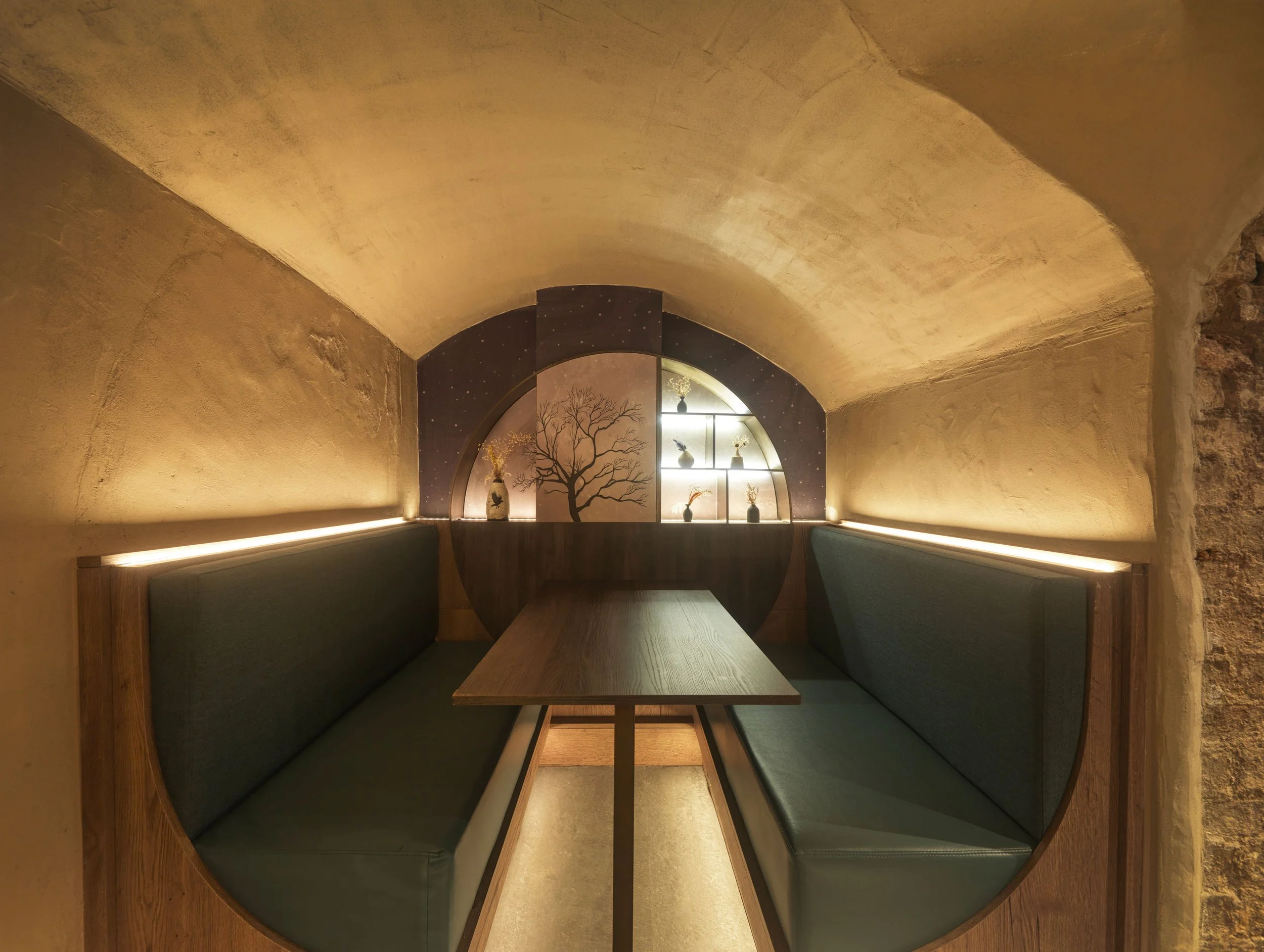 A retail store where raw plaster meets smooth metal and velvet seating — instantly setting a tone of quiet luxury.